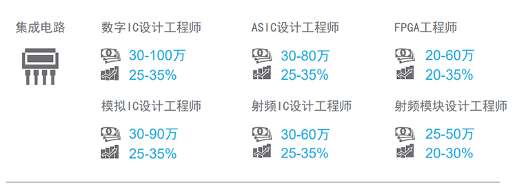 薪酬趋势:集成电路领域,RFID、机器视觉、云计算、大数据、智能芯片、工业以太网等薪资上涨比较明显,跳槽涨幅能到40%。智能生产线方向薪资较上年有轻微的下滑趋势,自然涨幅在25%,跳槽涨幅最高能到30%。