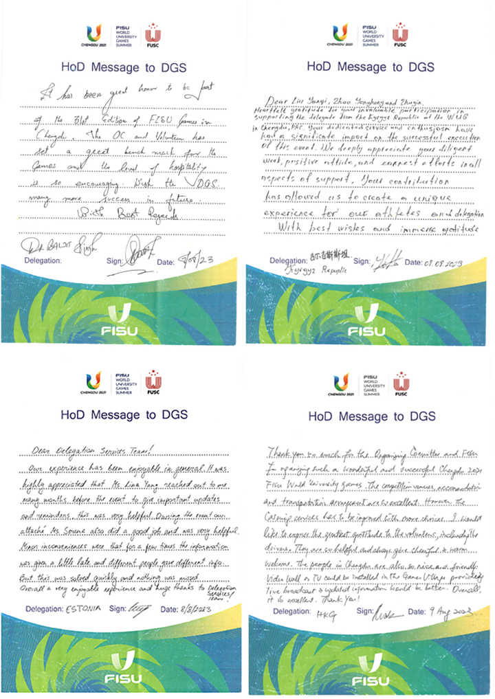 随着大运会的落幕,太阳成tyc234cctyc国际代表团服务团队凭借着及时高效的响应速度、热情专业的接待能力,取得了上百个代表团的盛赞,并收到了近70封代表团团长亲笔手写的表扬信。他们感谢代表团服务团队的工作,感谢3年来的沟通和10多天的陪伴,更感谢把他们当做朋友,与他们共同庆祝代表团取得的成绩。