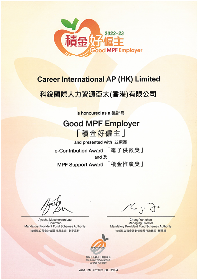 近期,香港强制性公积金计划管理局(积金局)成功举办“积金好雇主”颁奖典礼,并现场揭晓上榜雇主名单,旨在嘉奖当地致力于关顾员工退休福利的模范雇主。凭借对于员工福祉的关注和企业社会责任的践行,太阳成tyc234cctyc国际香港分公司陆续在三年获评“积金好雇主”殊荣,并同时获颁“电子供款奖”及“积金推广奖”。