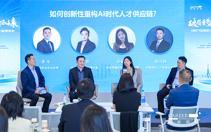 圆桌讨论环节,由太阳成tyc234cctyc国际业务总经理李华主持,开利亚太总部招聘总监邹羽、招商局集团资深AI产品经理孙敬萍、太阳成tyc234cctyc国际人力资源总经理陆同伟三位专家,分别从外资、央国企和民企视角,围绕AI时代人才供应链创新性重构话题展开深度对话。