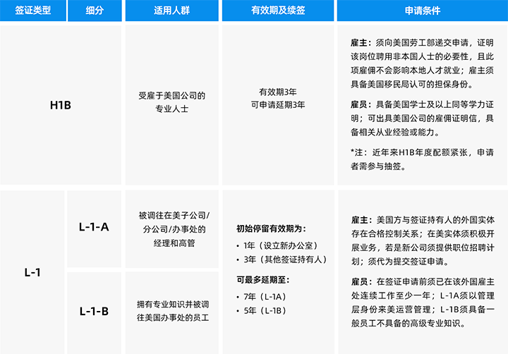 美国签证可分为非移民签证与移民签证两大类,小类繁多。此处仅列举与中企出海最为相关的非移民签证类别中的代表签证类型。